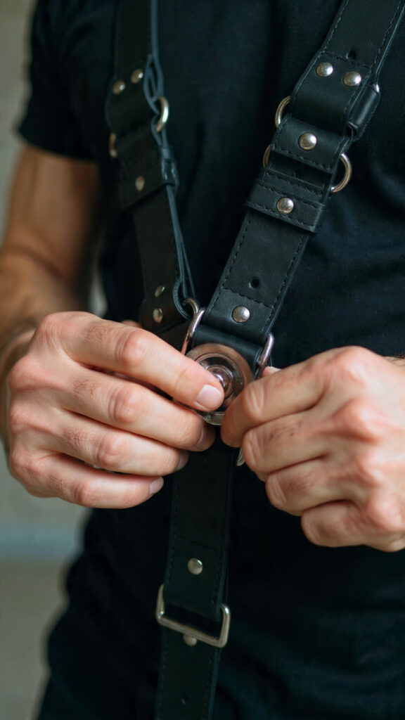Un buen arnés debe ser de cuero real o de materiales técnicos de alta resistencia (como neopreno o cintas industriales). Es una pieza que va pegada a tu piel; merece la pena invertir en calidad.